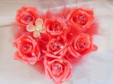 تعتبر الورود والشوكولاتة من أكثر الهدايا التي ترمز إلى مشاعر الحب، فلماذا لا تدمجها معاً وتصنع منها قلب جميل؟ كل ما ستحتاج إليه هو قطعة من الفلين، وقطع شوكولا مغلفة دائرية، وشرائط من الساتان والأورجانزا، وأعواد خشبية، ومسدس صمغ ساخن، وورق كربون، ومجموعة من الورود الصناعية، ومجموعة من عناصر الزينة.